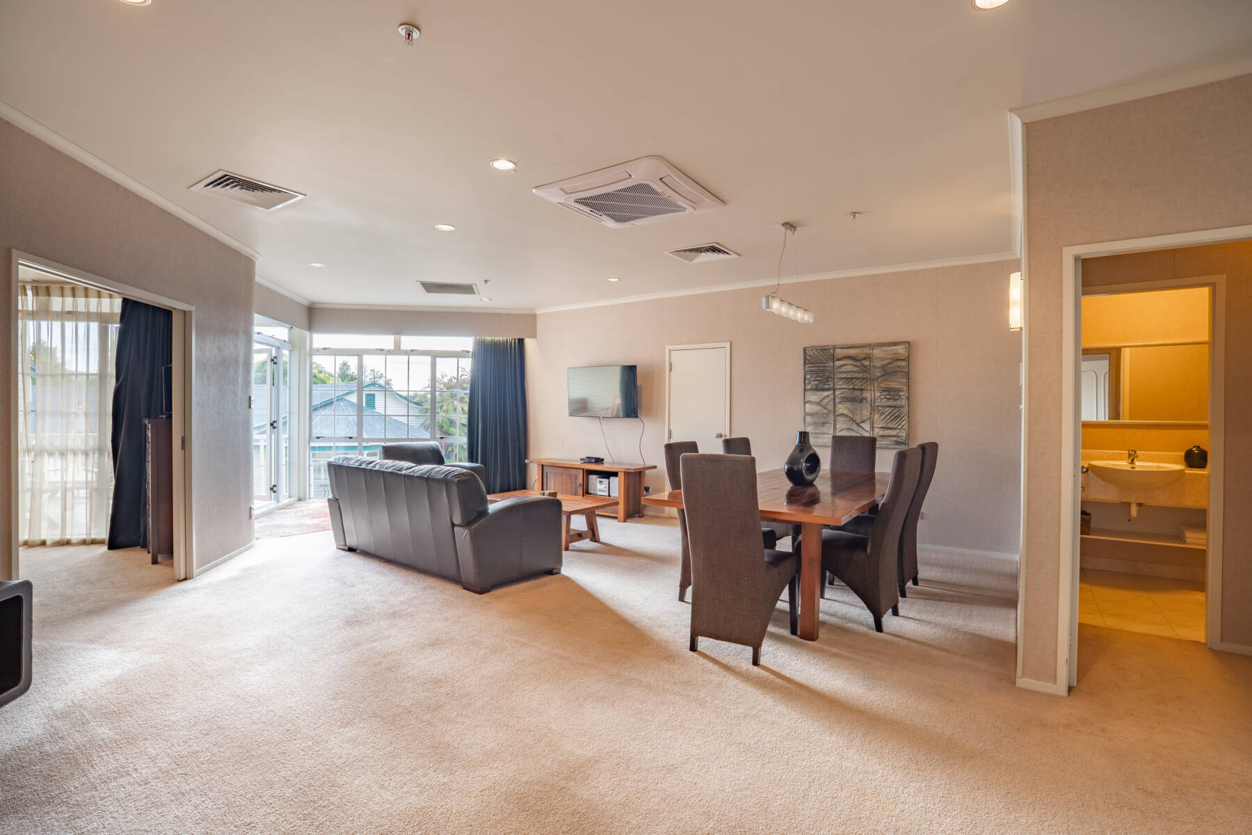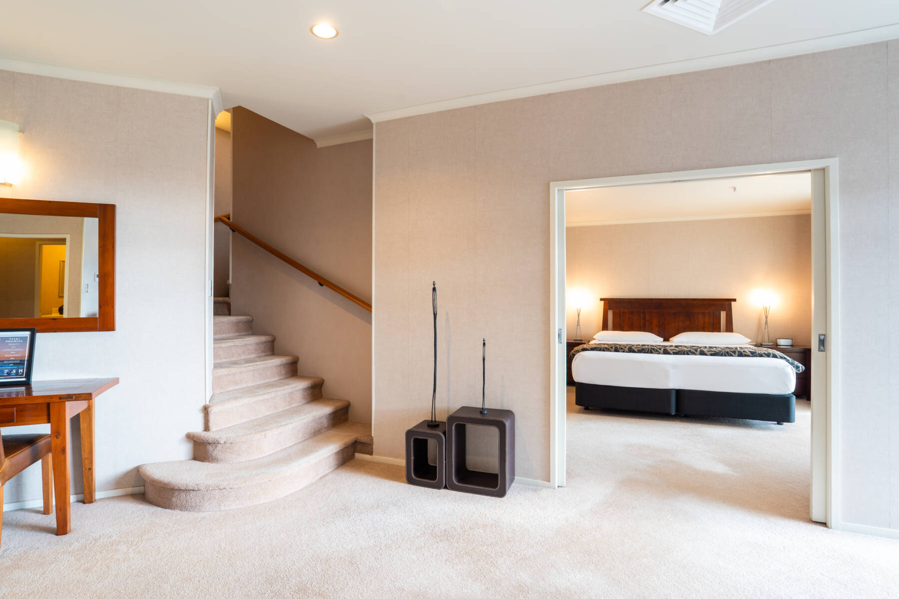 The luxurious, split-level Rangatira Suite is a spacious air-conditioned 2-bedroom unit for a maximum of 4 guests using existing bedding, so it’s perfect for hosting intimate cocktail parties or business meetings. The open-plan living area features stylish furnishings in warm chocolate tones and a dining table that seats up to 8 people. You can relax in an airy master bedroom with a king-size bed, an en-suite bathroom with a spa bath, or on your private balcony. The upstairs bedroom offers a king-size bed and an en-suite bathroom. There’s a butler-style pantry and a main bathroom, and the suite can interconnect with an adjoining twin room if you need 3 bedrooms. Connect to high-speed WiFi to check your emails before sinking into the leather sofa to watch a selection of Sky TV channels, or simply listen to your favourite music on the stereo. Complimentary tea and coffee making facilities help provide the perfect start every morning.